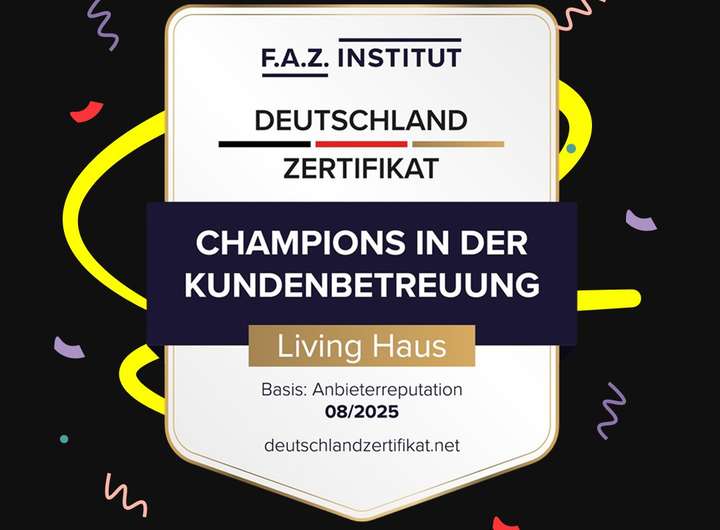 Deine Ausstattung bei Living Haus ist ein Rundum-Sorglos-Paket auf höchstem Niveau. Die Safety-First-Garantien umfassen eine 18-monatige Festpreisgarantie, komplette Bauversicherungen und umfassende Gewährleistungen. Highlights sind die DGNB-Serienzertifizierung in Gold und 30 Jahre Garantie auf die Grundkonstruktion.
