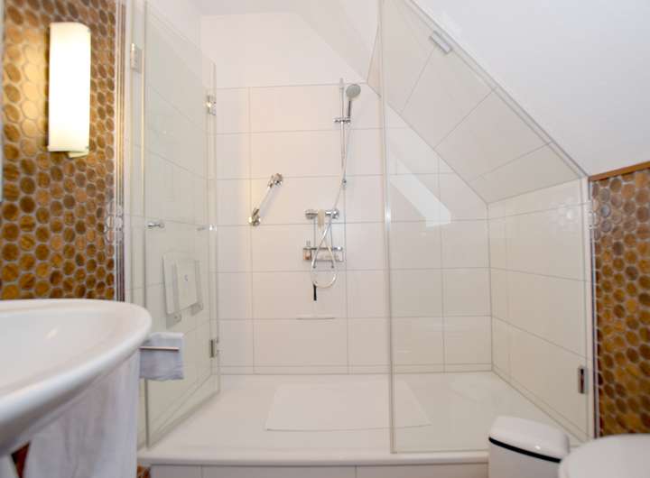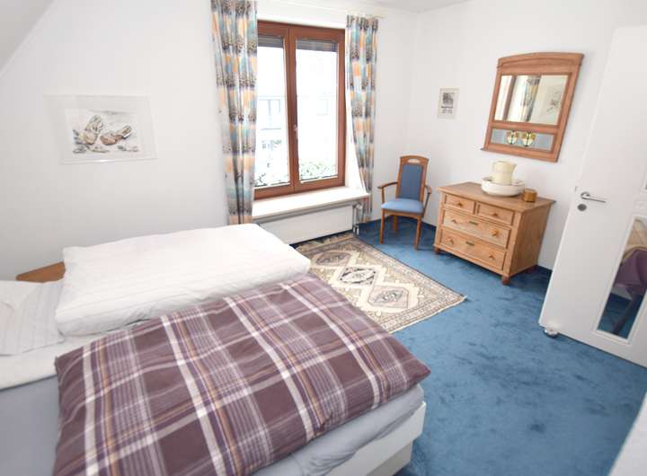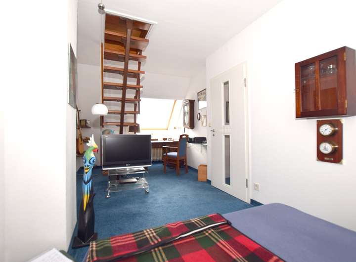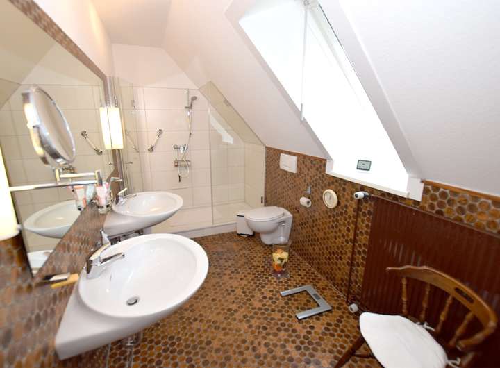 Dachgeschoss: zwei geräumige Schlafzimmer mit heller Dekoration und Teppichboden, eines mit Zugang zu einem begehbaren Schrankbereich, das andere mit Treppe hinauf in das ausgebaute Dachstudio; geräumiges Bad mit großer Dusche und zwei Waschtischen sowie WC.