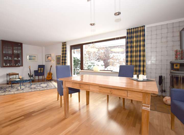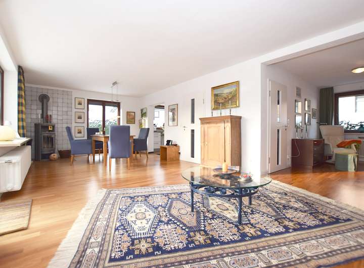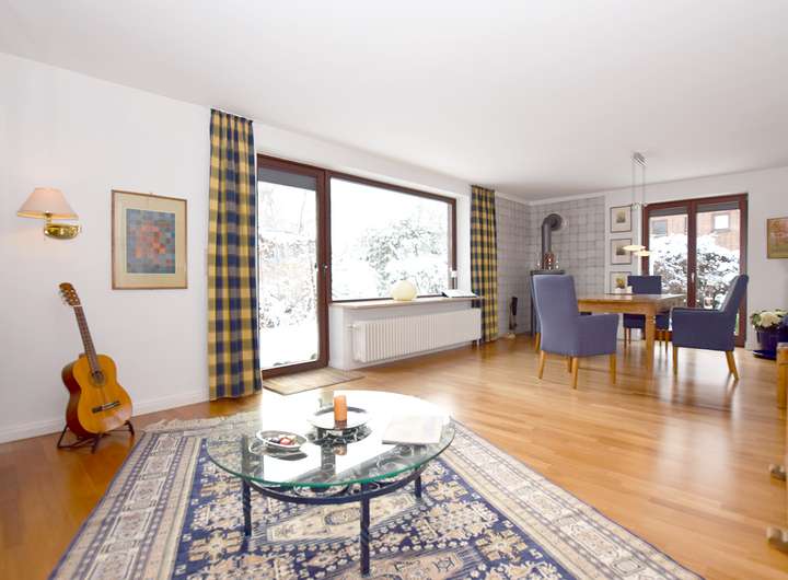 Erdgeschoss: großzügiger Wohn- und Essbereich mit Parkett, Kaminofen sowie großer Fensterfront Richtung Terrasse und Garten; halboffen angebundenes Zimmer, ebenso halboffen angeordnete Küche mit weißer Miele-Einbauküche und Granitarbeitsplatte; Diele, Garderobe und Gäste-WC.