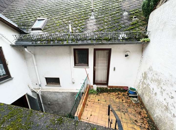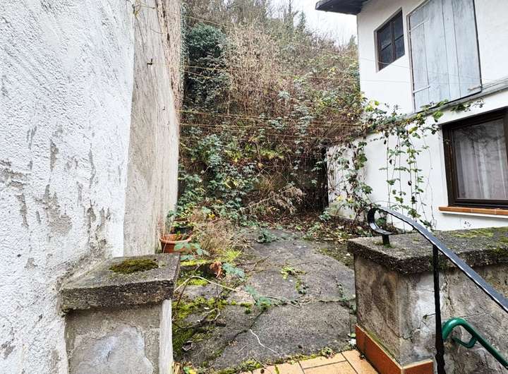 Vom Badezimmer aus gelangt man über eine kleine Terrasse in den Außenbereich, der sich zum größten Teil in Hanglage befindet.