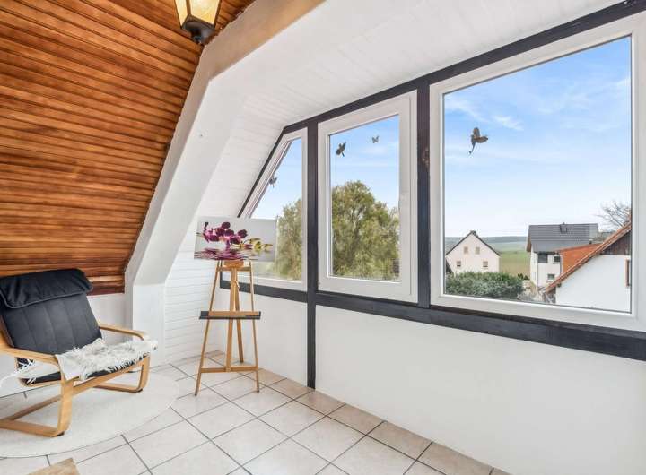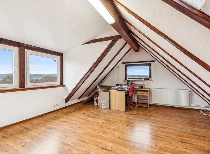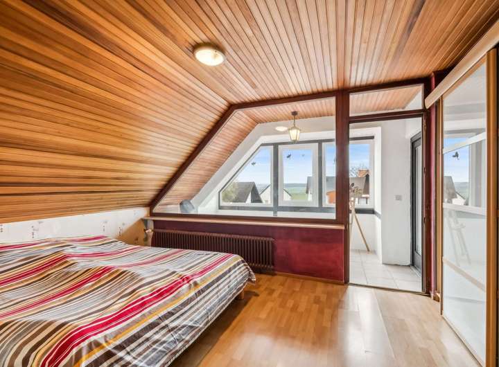 Über eine offene Holztreppe erreichen Sie das Obergeschoss. Dies teilt sich wie folgt auf: Zwei separate Zimmer, ein Bad mit Dusche, WC und Waschbecken, ein weiteres separates Zimmer mit Zugang zum Balkon.