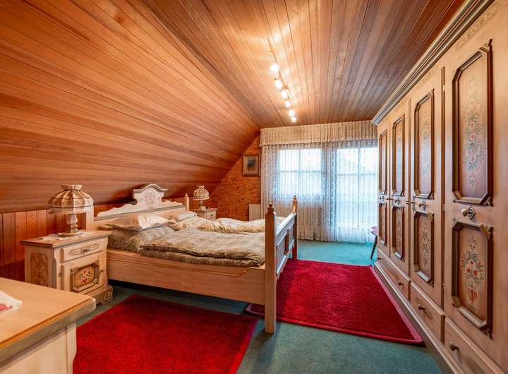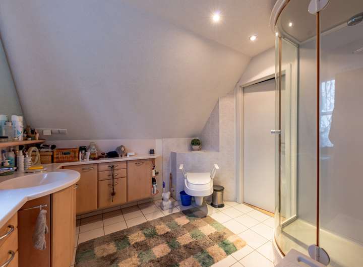 Im oberen Stockwerk stehen drei Schlafräume zur Verfügung, ergänzt durch zwei weitere Bäder, die für hohen Wohnkomfort sorgen.