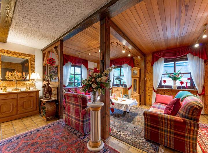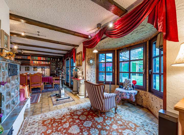 Der zentrale Wohnbereich im Erdgeschoss vereint Wohnen, Essen und Kochen in einem weitläufigen Raumkonzept. Ein mittig platzierter Kachelofen bildet dabei einen besonderen Blickfang. Zwei direkt angeschlossene Wintergärten schaffen zusätzliche Aufenthaltsqualität und lassen durch ihre großflächige Verglasung viel Tageslicht ins Haus. Abgerundet wird diese Etage durch ein Badezimmer.