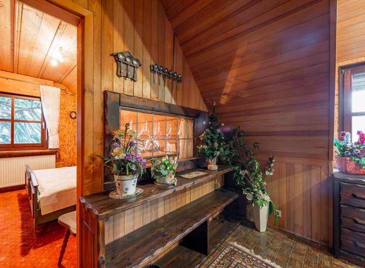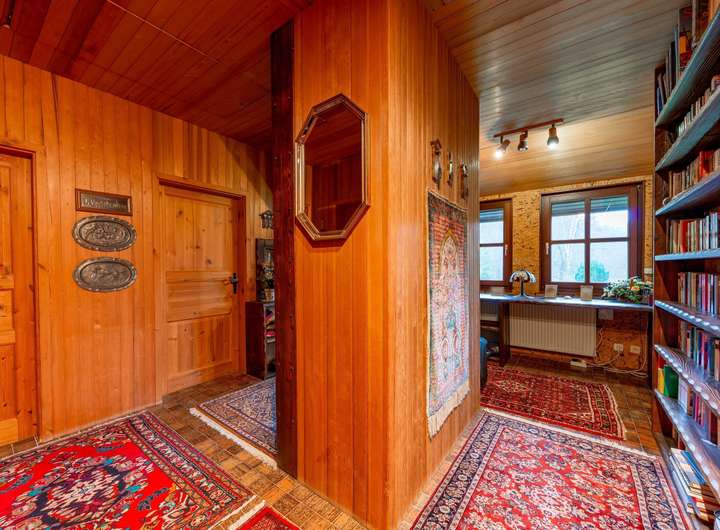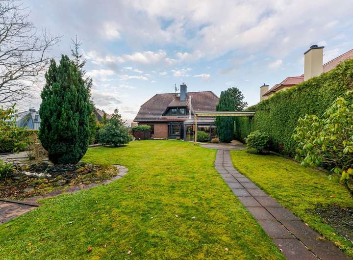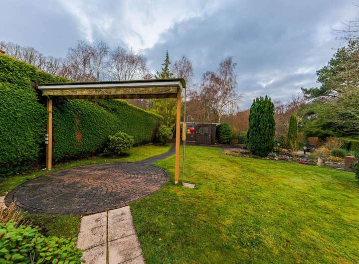 Der Außenbereich ist großzügig und naturnah gestaltet. Neben Rasenflächen finden sich eine Teichlandschaft sowie abwechslungsreiche Bepflanzungen. Direkt angrenzend erstrecken sich Wiesen und Waldflächen, während hinter dem Grundstück ein kleiner Bach verläuft und die idyllische Lage unterstreicht.