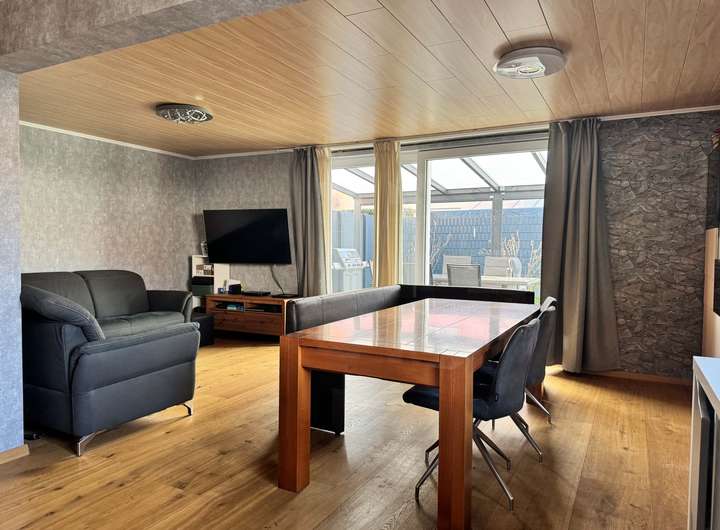 Im Erdgeschoss öffnet sich der Wohn- und Essbereich mit einer Einbauküche, von dem aus man direkt auf die überdachte Terrasse und in den Garten tritt. Seitliche Glaselemente und elektrische Senkrechtmarkisen schützen bei jedem Wetter und laden zum Frühstück im Freien ein. Das Echtholzparkett im Wohnbereich verströmt Wärme und Wertigkeit. Zudem erleichterten eine praktische Toilette und der Hauswirtschaftsraum den Alltag auf dieser Etage.