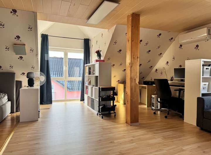 Das klimatisierte Dachgeschoss bietet ein weiteres Schlafzimmer mit Ankleidebereich und ein helles Tageslichtbad.