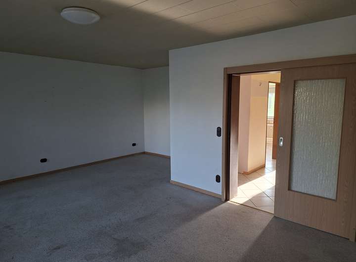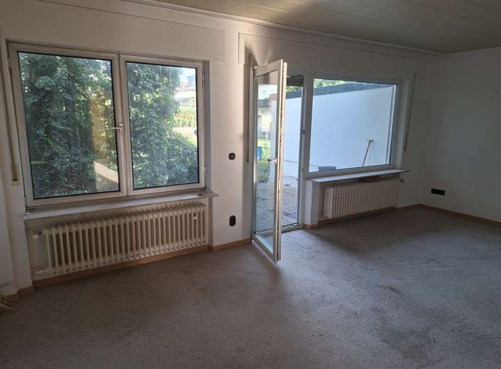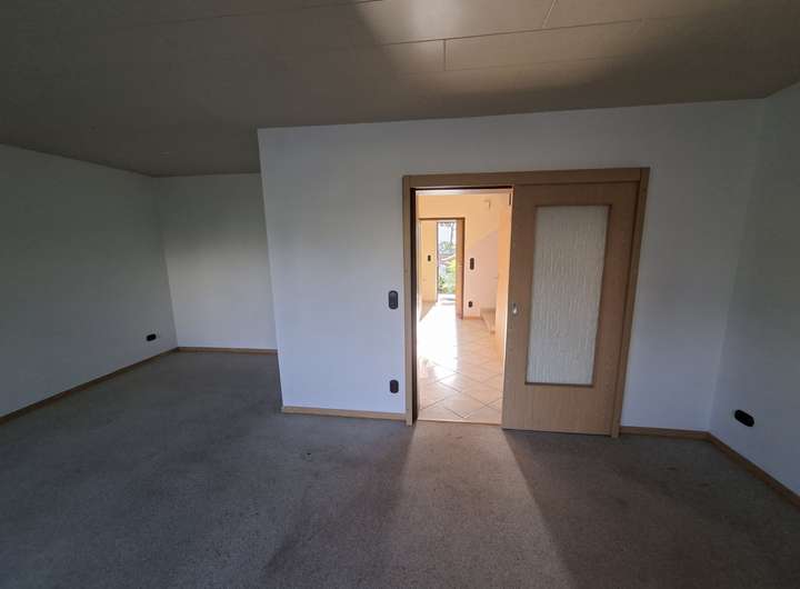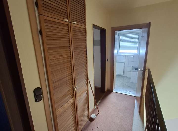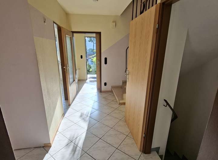 Im Erdgeschoss befindet sich im Eingangsbereich die Gäste-Toilette, Flur mit einer Nische, die große Küche, großes Wohnzimmer mit Zugang zur West-Terrasse und dem großen Garten. Über die Steintreppe gelangt man in das Obergeschoss. Mit Flureinbauschrank.