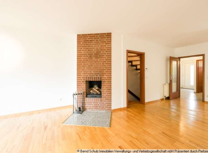 Das Erdgeschoss umfasst eine Küche, ein Gäste-WC, eine Diele mit einer Holztreppe sowie ein großzügiges Wohnzimmer mit Zugang zu dem pflegeleichten Gartenstück mit Terrasse. Das Wohnzimmer mit Essbereich ist mit Parkett ausgestattet. Ein Kamin sorgt nicht nur in der kalten Jahreszeit für Gemütlichkeit. Vom Wohnzimmer gelangt man auf die schöne West-Terrasse und den dahinter liegenden Gartenbereich. An der Terrasse befinden sich ein kleiner Teich und ein Holzlager.
