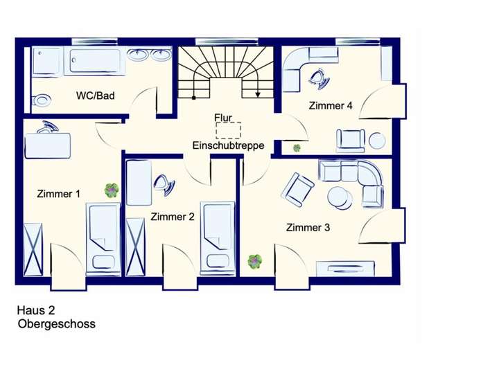 Auch das Obergeschoss überzeugt durch außergewöhnliche Großzügigkeit: Insgesamt stehen Ihnen vier Schlafzimmer mit Größen zwischen 11,5 m² und 17,7 m² zur Verfügung – ideal für Familien mit Kindern. Aber auch wenn Sie Arbeiten und Wohnen unter einem Dach miteinander verbinden möchten, finden Sie hier ideale Bedingungen.