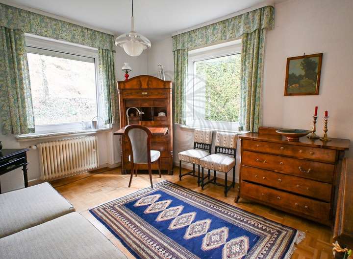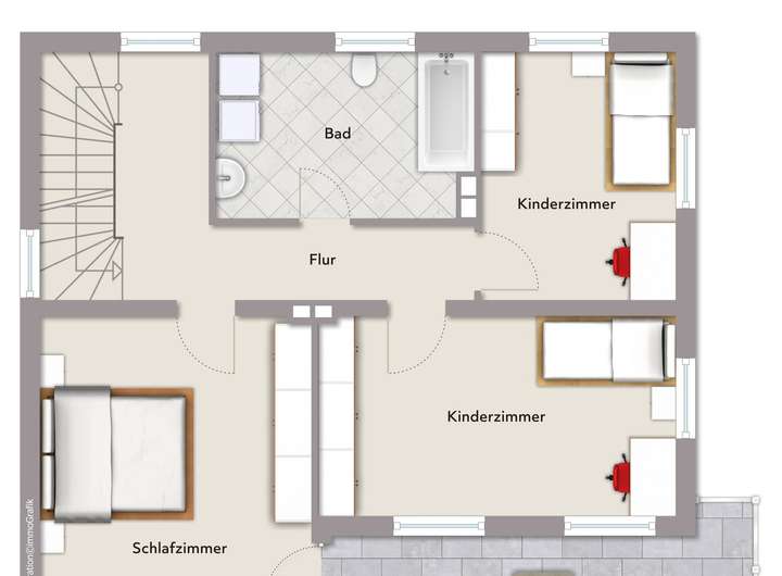 Über die Treppe gelangen Sie ins Obergeschoss. Hier sind die privaten Räume zusammengefasst: ein Schlafzimmer sowie zwei weitere Zimmer, ideal als Kinder-, Arbeits- oder Gästezimmer. Das Badezimmer mit Badewanne und Dusche liegt zentral und ist von allen Räumen gut erreichbar. Ein Balkon ergänzt diese Ebene und bietet zusätzlichen Freiraum und Ausblick.