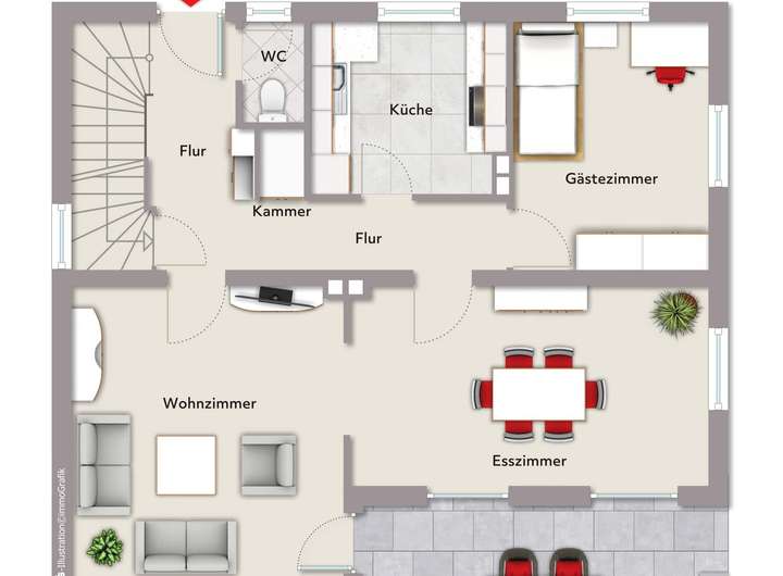 Sie betreten das Haus über den zentralen Eingangsbereich und gelangen zunächst ins Erdgeschoss, das klar strukturiert und auf das tägliche Leben ausgerichtet ist. Vom Flur aus erreichen Sie das Gäste-WC sowie eine praktische Kammer für Vorräte oder Stauraum. Die Küche ist separat angeordnet, gut belichtet und funktional geschnitten.