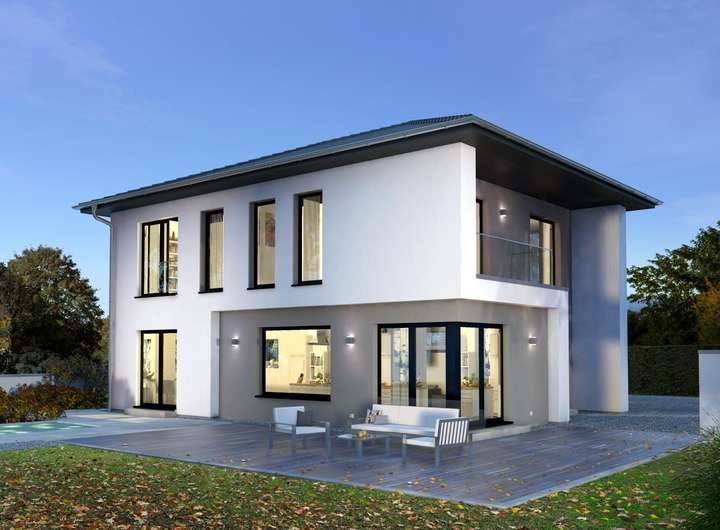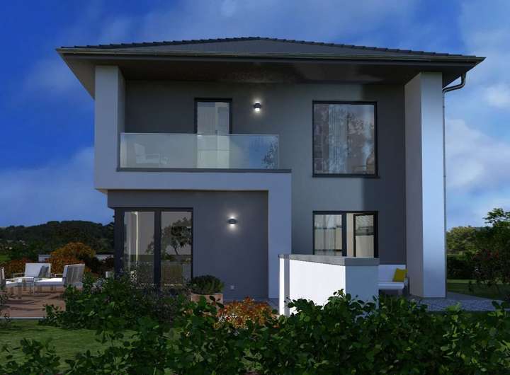 Mediterran-elegant präsentiert sich unsere Stadtvilla 13: Mit ihrem charakteristischen Walmdach, der durch verschiedene Vorsprünge strukturierten und aufgelockerten Fassade sowie den zahlreichen Fenstern und Glastüren ist sie ein wahrhaftiger Blickfang. Auch im Inneren überzeugt sie durch viele Vorzüge: Der offen gestaltete Koch-Ess-Wohnbereich im Erdgeschoss ist geräumig und lichtdurchflutet, was ihn zum perfekten Treffpunkt für die ganze Familie macht. Auf dieser Ebene finden Sie zudem einen etwa 13 m² großen Raum, der flexibel als Büro oder Gästezimmer genutzt werden kann, sowie einen Hauswirtschaftsraum, der geschickt durch die Treppe ins Obergeschoss abgetrennt ist. In der ersten Etage haben sowohl Eltern als auch Kinder ihren eigenen großzügigen Bereich. Besonders clever gelöst: Im Elternbereich gehen Schlaf-, Ankleide- und Badezimmer nahtlos ineinander über. Auch die beiden Kinderzimmer sind mit einem gemeinsamen Bad ausgestattet.