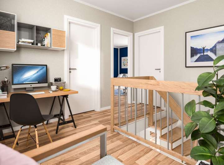 Im Erdgeschoss genießen die Bewohner ihren Alltag – vom morgendlichen Frühstück in der Küche oder Esszimmer bis zum gemütlichen Abend im Wohnzimmer. Im Obergeschoss bietet das Kinderzimmer viel Raum zur Entfaltung. Schlaf- und Badezimmer laden zum Abschalten und Entspannen ein. Besonderes Highlight – die lichtdurchflutete Galerie.