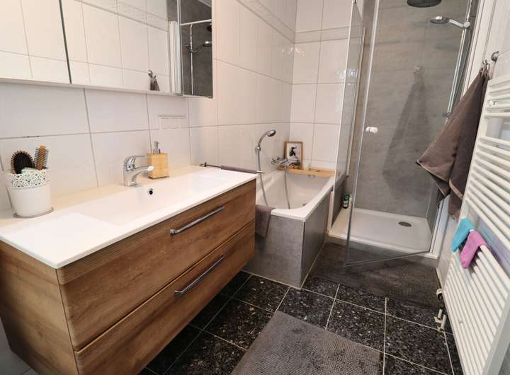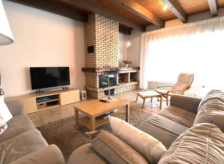 Die Immobilie erstreckt sich über zwei Etagen und umfasst eine Gesamtwohnfläche von ca. 203 m² auf einem weitläufigen Grundstück von ca. 1.034 m². Im Erdgeschoss befindet sich eine großzügige Wohnung mit ca. 137,5 m², die fünf Zimmer, eine Küche und zwei gut ausgestattete Badezimmer (ein Badezimmer 2025 teilsaniert) umfasst. Ein besonderes Highlight dieser Wohnung ist der gemütliche Kamin, der an kühleren Tagen eine wohlige Atmosphäre schafft. Die neue moderne Einbauküche (2022) ist der perfekte Ort, um kulinarische Köstlichkeiten zu zaubern, während die hochwertigen Fliesenböden in den Wohnbereichen für ein elegantes Flair sorgen.