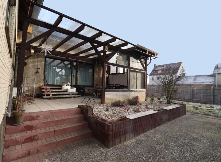 Ein besonderes Highlight ist die große überdachte Terrasse, die sich ideal für sommerliche Abende und geselliges Beisammensein eignet. Der schöne Garten rundet das ansprechende Gesamtbild ab und bietet ausreichend Raum für Spiel, Erholung und Gartenarbeit.