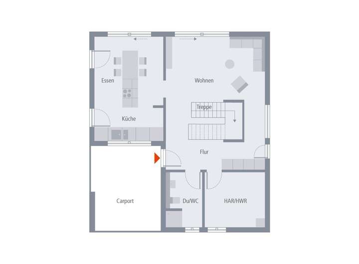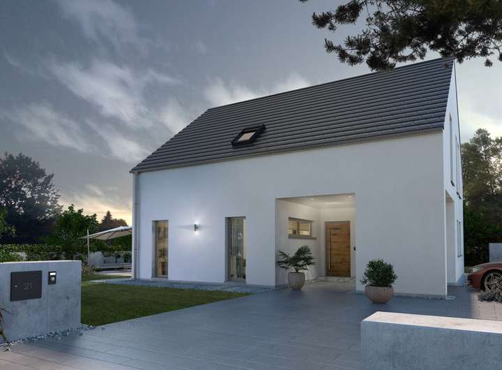 Blickfang des Design 21 ist die zentral gelegene, halbgewendelte Treppe, die das Erdgeschoss mit dem Obergeschoss verbindet und zudem als Raumtrenner zwischen Diele und Wohnzimmer dient. Das Wohnzimmer wirkt durch seine offene Bauweise zum Flur hin besonders geräumig. Daran schließt sich, durch eine Tür getrennt, der Koch-Ess-Bereich an. Bei einer Größe von rund 25 m² bietet sich hier die Installation einer Kochinsel an. Ein Gäste-WC mit Dusche sowie ein Hauswirtschaftsraum befinden sich ebenfalls im Erdgeschoss. Außerdem ist hier ein Carport integriert, über den auch der Zugang zum Innenbereich erfolgt. Im Obergeschoss des Hauses halten sich Eltern und Kinder gerne auf, bietet es doch alles, was das Herz begehrt: Das Schlafzimmer der Eltern ist mit 20 m² Grundfläche großzügig bemessen und das angeschlossene Bad mit Komplettausstattung direkt von hier zu erreichen. Doch auch für die Kinder ist in den drei großen Zimmern ausreichend Platz und ein weiteres Badezimmer.