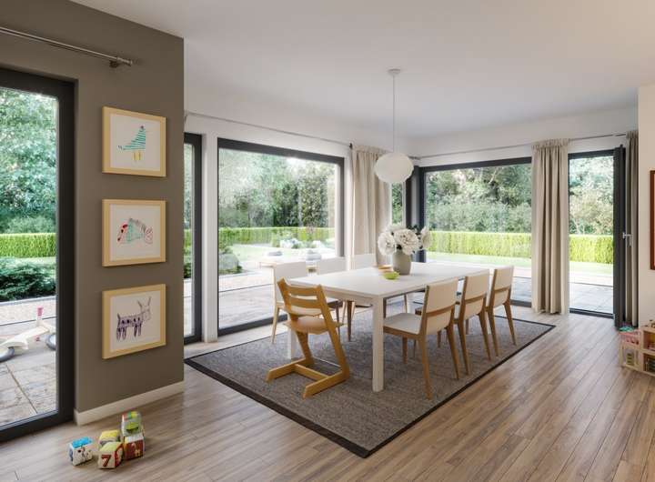 Dieses wunderschöne Einfamilienhaus in Poppenbüttel überzeugt durch seine durchdachte Architektur und die Möglichkeit, nach deinen persönlichen Wünschen und Vorstellungen projektiert zu werden. Mit einer großzügigen Wohnfläche von 143,81 m² und fünf Zimmern bietet es genug Platz für die ganze Familie. Der klassische Satteldach mit einer Neigung von 38 Grad verleiht dem Haus eine charmante Optik, während die bodentiefen Fenster für einen lichtdurchfluteten Wohn- und Lebensbereich sorgen. Hier kannst du mit kleinen Kniffen viel Platz und Licht in dein Zuhause bringen und eine entspannte, einladende Atmosphäre schaffen.