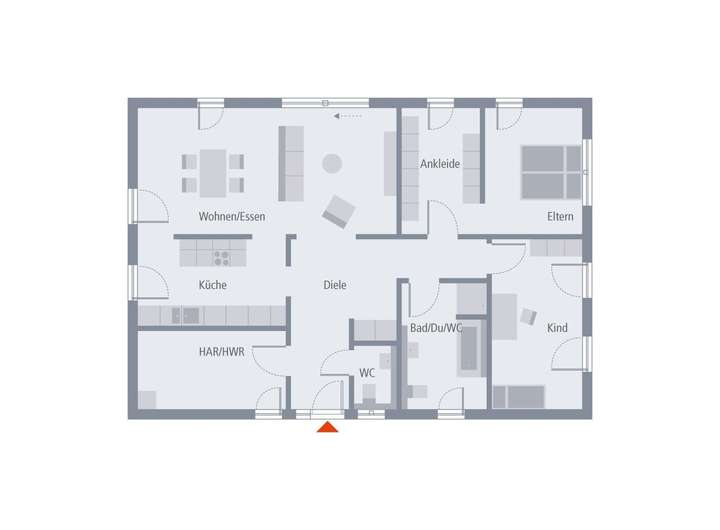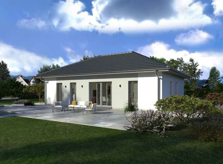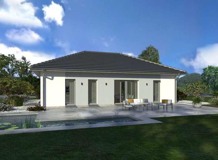 Unser Bungalow 1 Walmdach bietet auf einer Wohnfläche von 107 m² alles, was die Kleinfamilie zum Wohnen und Wohlfühlen benötigt. Das kombinierte Wohn-Ess-Zimmer ist großzügig geschnitten und dank drei Glastüren zum Garten hin schön hell. Auch die vom Esszimmer türlos zugängliche Küche bietet genügend Platz und Tageslicht. Der angrenzende, 10 m² große Hauswirtschaftsraum ist auch direkt von außen betretbar und hat dadurch gleich in doppelter Hinsicht einen praktischen Nutzen: Einkäufe können auf diese Weise direkt versorgt werden und die Wohnräume bleiben von möglichen Schmutzschuhen verschont. Der ebenfalls geräumige Flur verbindet den Wohnbereich des Hauses mit den privaten Rückzugsorten: dem Bereich der Eltern mit Schlafzimmer und angeschlossener Ankleide und einem lichtdurchfluteten Kinderzimmer. Ein voll ausgestattetes Bad mit Badewanne und Dusche sowie ein Gäste-WC runden das Angebot ab.