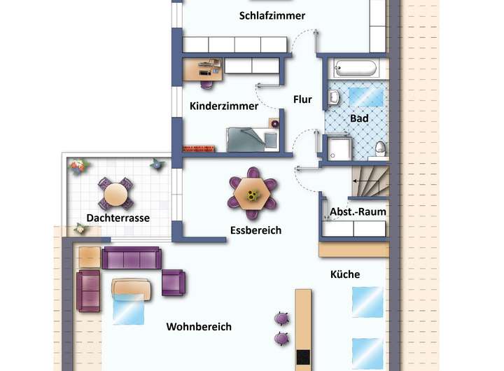 1 offener Küchen- / Wohn- / Essbereich mit Zugang zur Dachterrasse, 1 Schlafzimmer, 1 Kinderzimmer, 1 Tageslicht-Vollbad mit Dusche und Badewanne, 1 Flur, 1 Abstellraum.