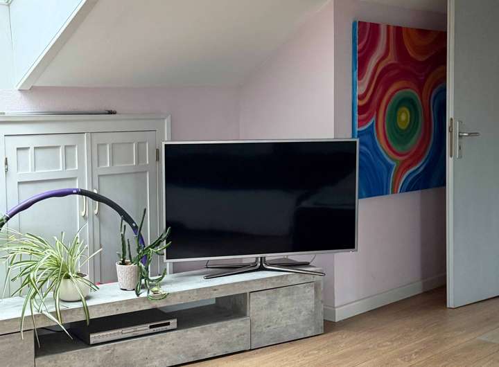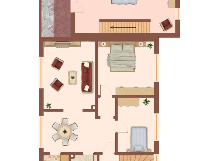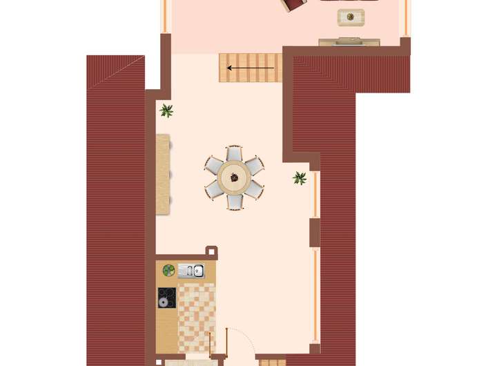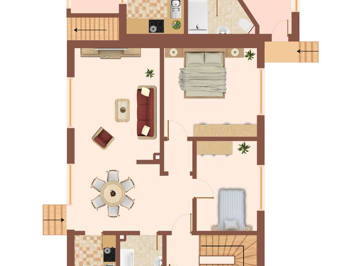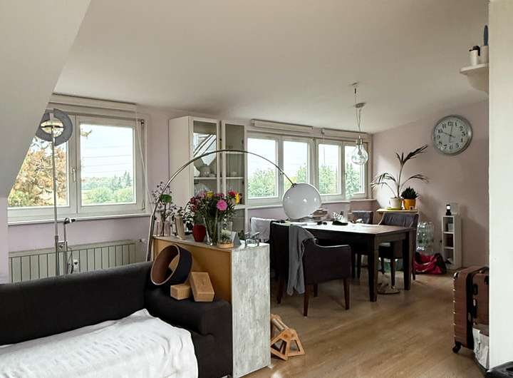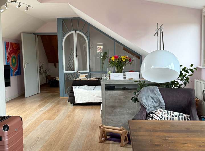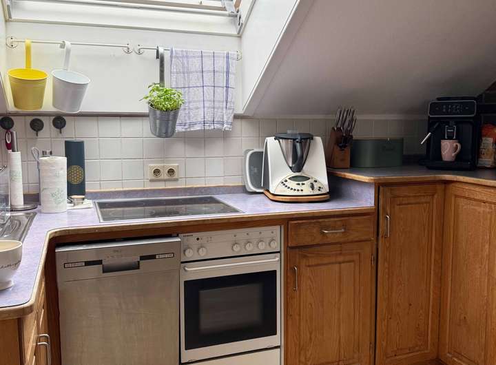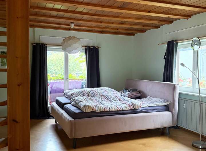 Im Dachgeschoss befindet sich dann die dritte Wohnung. Diese Wohnung verfügt über eine offene Küche, ein Tageslichtbad, einen geräumigen Essbereich, ein Wohnzimmer mit Balkon und ein großes Schlafzimmer - einen Stock tiefer.