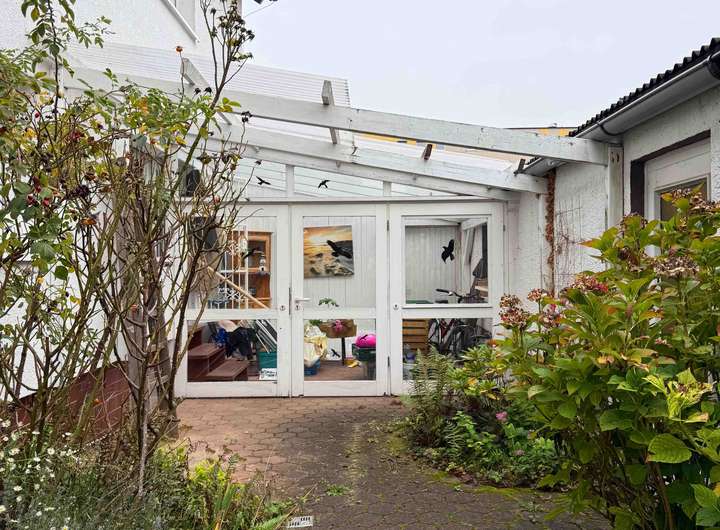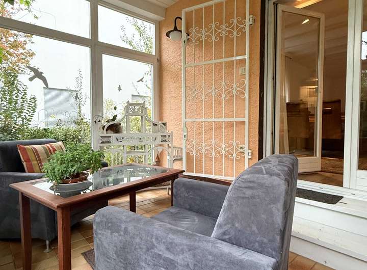 Im Erdgeschoss des Anbaus befindet sich der Einliegerbereich, ebenfalls mit Küche, Bad und kleinem Wintergarten.
