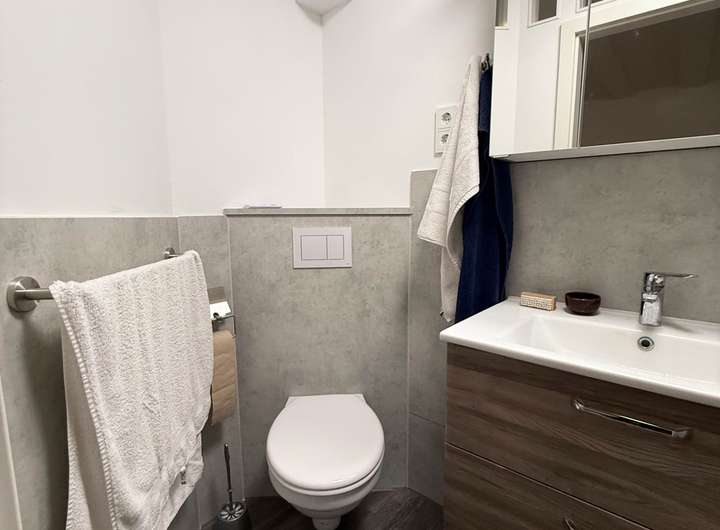 Im Erdgeschoss des Hauses befindet sich eine Drei-Zimmer-Wohnung mit Tageslichtbad und Küche. Dazu gehört außerdem eine überdachte Terrasse mit elektrischer Sonnenschutzmarkise.