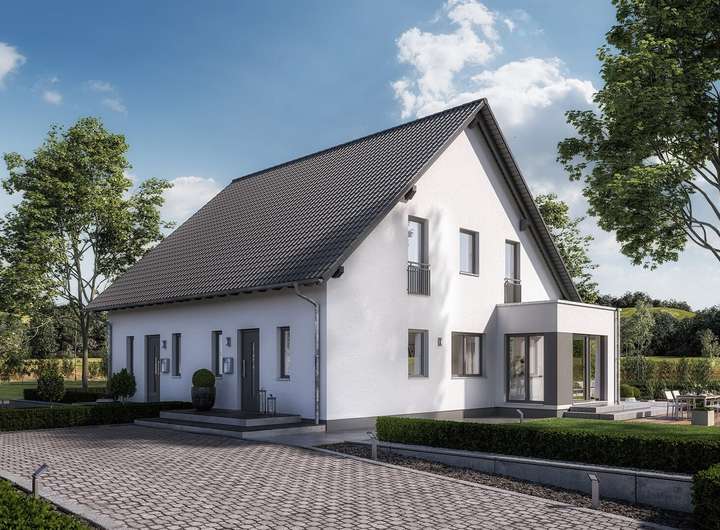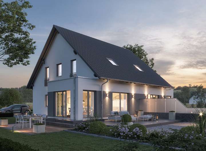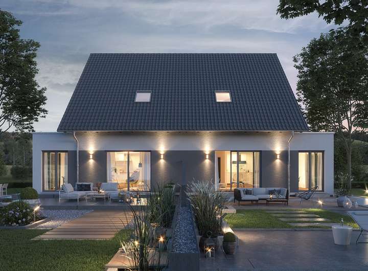 Geradlinig und klar in der Form: Das Doppelhaus TwinStyle 13.03 S ist mit seinen ca. 139 m² Nettogrundfläche ideal für die Verwirklichung individueller Wohnwünsche. Im Erdgeschoss bietet der clever geplante Wohn-Ess-Bereich mit offener Küche viel Raum für Gesellschaft. Im Obergeschoss stehen sich Kinderzimmer und Elternschlafzimmer einander gegenüber, getrennt durch ein gemeinsames Bad und durch eine Treppe mit angrenzender Galerie. Unter dem Spitzboden steht ein weiterer Raum für die persönliche Entfaltung bereit.
