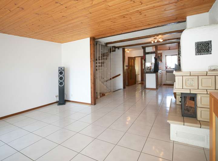 Eine großes, bodentiefes Fenster mit Blick in den Garten und die dazu gehörige Zugangstür, ebenfalls aus Glas, sorgen für eine angenehme Helligkeit im Wohnraum. Für eine wohlige Wärme in den kalten Monaten kann man den Kaminofen mit Heizkassette befeuern. Eine Garderobe und ein Gäste-WC sind ebenfalls im Erdgeschoss vorhanden.