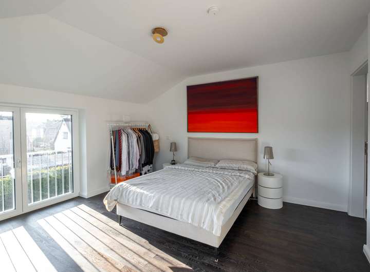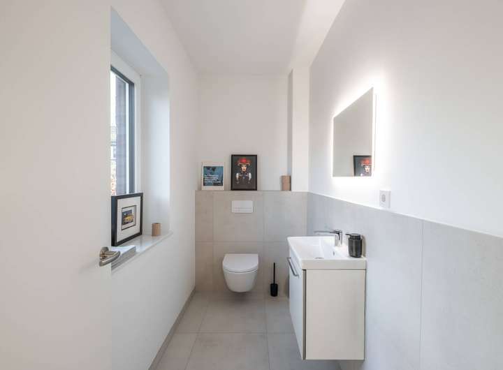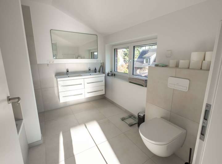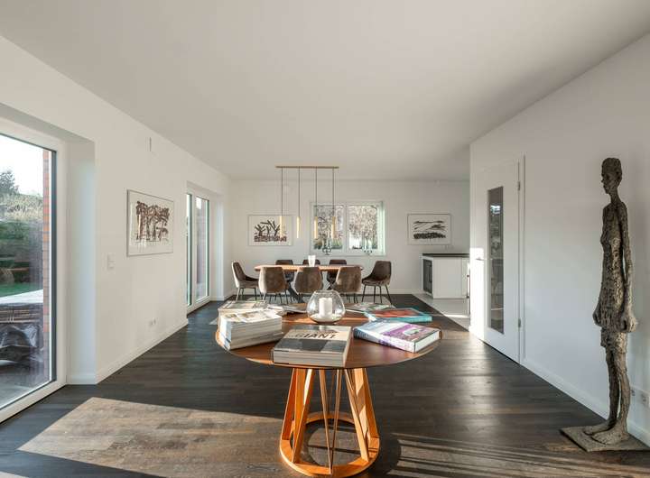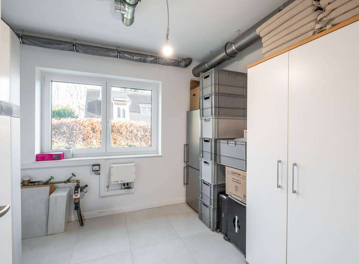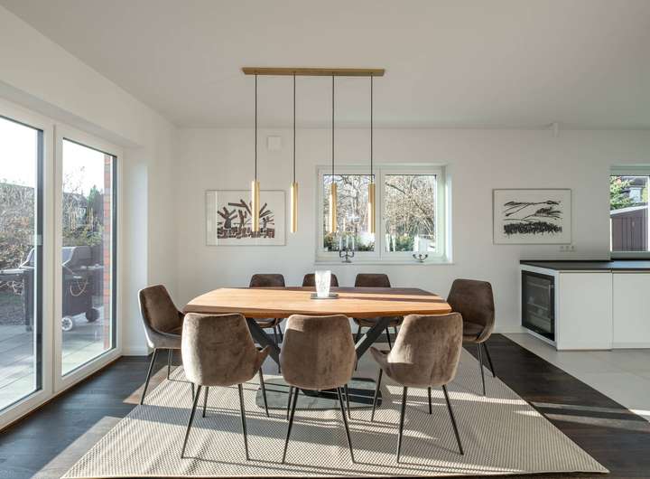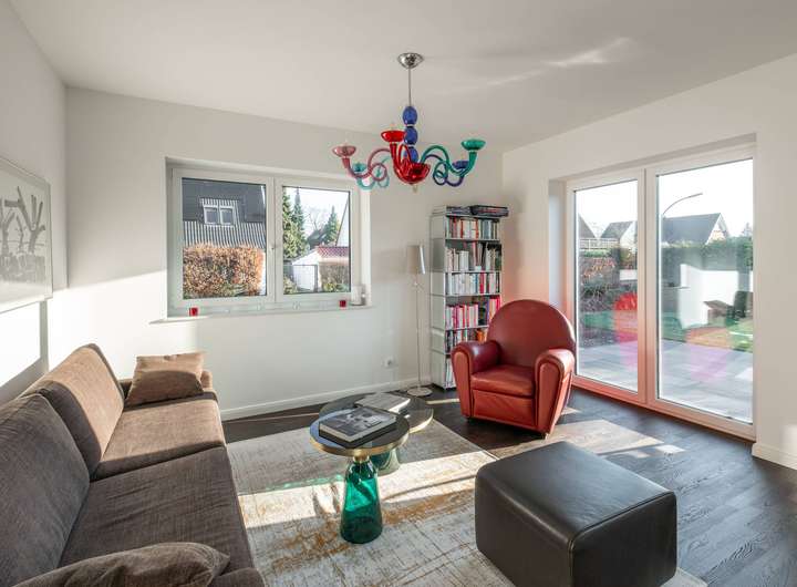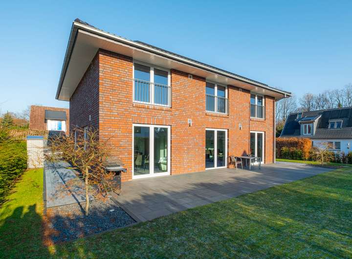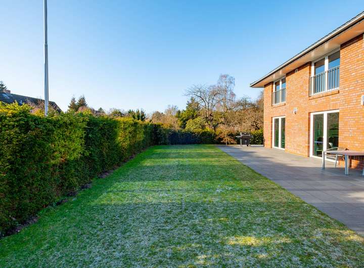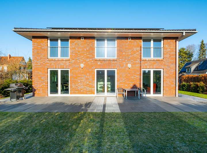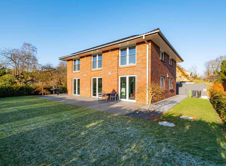 Dieses moderne Neubau-Einfamilienhaus in ruhiger Lage von Hamburg-Iserbrook überzeugt mit ca. 211 m² Wohnfläche und einem durchdachten Grundriss über zwei Etagen. Das Herzstück des Hauses bildet der großzügige, offen gestaltete Wohn- und Essbereich mit hochwertiger Einbauküche, der sich nahtlos zur sonnigen Terrasse und dem liebevoll angelegten Garten öffnet. Im Obergeschoss stehen neben dem großzügigen Hauptschlafzimmer zwei helle Kinderzimmer, ein Arbeitszimmer sowie zwei stilvoll ausgestattete Bäder mit Armaturen von Villeroy & Boch und Dornbracht zur Verfügung, eines davon als komfortables en suite Bad. Große Fensterflächen sorgen in allen Räumen für eine angenehme Lichtdurchflutung und ein besonders freundliches Wohnambiente.