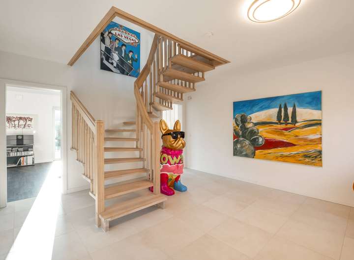 Das Haus erfüllt den KfW-40-Standard und bietet dank hochwertiger Ausstattung mit Parkettboden, Fußbodenheizung, moderner Wärmepumpe und Photovoltaikanlage ein besonders energieeffizientes und zukunftsorientiertes Wohnkonzept. Zwei Außenstellplätze runden dieses attraktive Angebot ab. Ein ideales Zuhause für Familien, die modernen Wohnkomfort, Nachhaltigkeit und eine ruhige Lage schätzen.