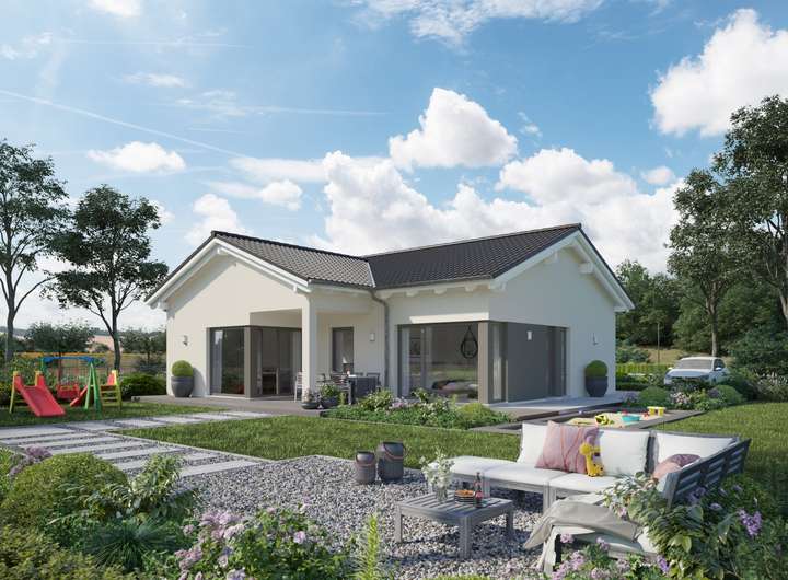 Der LivingHaus Bungalow in Marmstorf ist mehr als nur ein Haus - es ist dein perfekter Begleiter in ein neues Leben mit Eigenheim. Mit einer Wohnfläche von 81,58 m² und einem großzügigen Grundstück von 1095 m² bietet dieser Bungalow Platz für deine individuellen Wünsche. Das Satteldach mit komfortablem Dachüberstand verleiht dem Gebäude einen charmanten Charakter, während das Querhaus, ebenfalls mit Satteldach, deinen Wohnraum auf rund 90 Quadratmeter erweitert und dir einen überdachten Freisitz bietet - ein echter Gewinn an Lebensqualität. Hier findest du alles, was du für dein neues Zuhause benötigst: einen einladenden Wohn-, Koch- und Essbereich, zwei gemütliche Schlafzimmer und ein modernes Badezimmer. Alles ist so gestaltet, dass du dich vom ersten Moment an wohlfühlst und dein individuelles Traumhaus realisieren kannst.