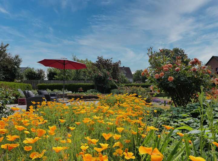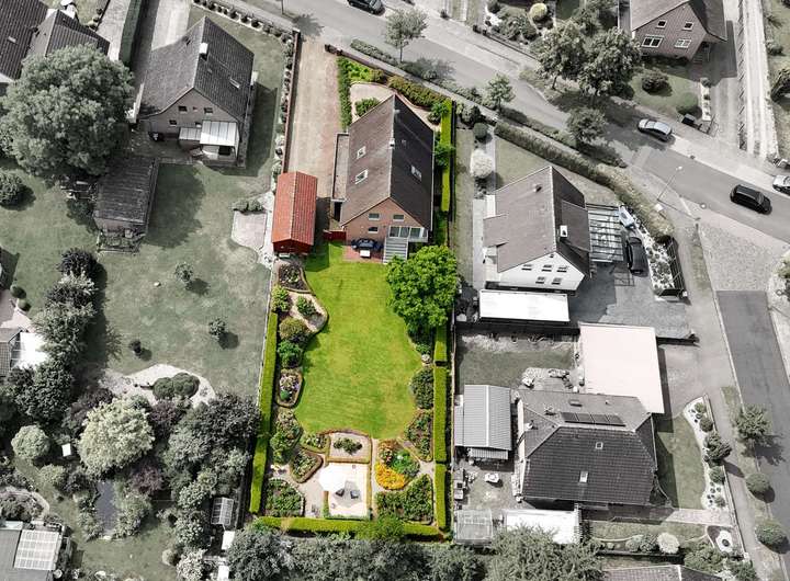 Dieses besondere Zuhause steht auf einem rund 1.165 m² großen Grundstück, das mit viel Liebe und Blick fürs Detail in einen parkähnlichen Garten verwandelt wurde. Der Garten ist mehr als Außenfläche, er ist Lebensraum. Er prägt das gesamte Hausgefühl. Wer hier lebt, lebt mit Blick ins Grüne, mit Rosen, gewachsenen Strukturen, lauschigen Ecken.