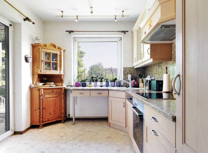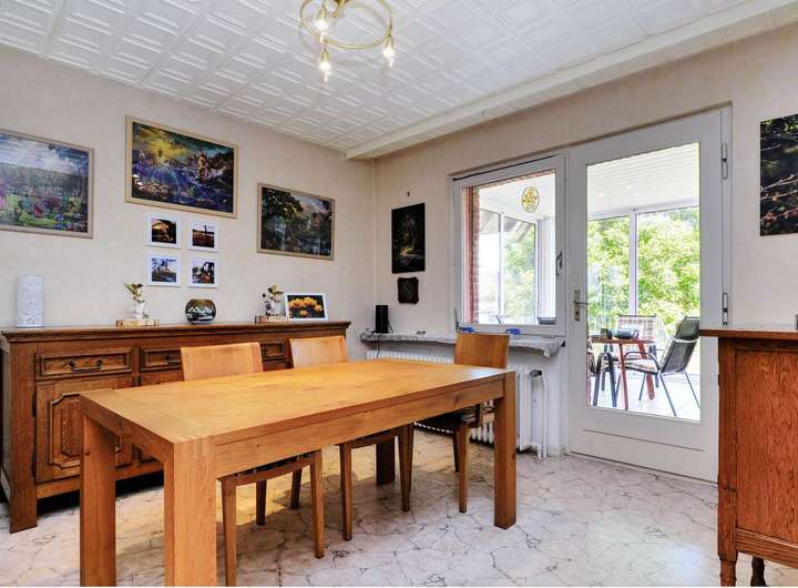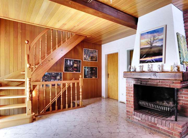Das Haus selbst wurde 1963 erbaut und 1978 erweitert. Es bietet heute ca. 152 m² Wohnfläche zuzüglich eines großzügigen Wintergartens mit aufschiebbaren Glasflächen und direktem Blick über das Grün. Im Erdgeschoss liegt ein zentraler Flur mit offenem Kamin. Von dort aus geht es in das Wohnzimmer und in ein weiteres Zimmer, das aktuell als Esszimmer genutzt wird Die Küche ist hochwertig ausgestattet, mit Marmorarbeitsflächen. Ein Gäste-WC mit Dusche ergänzt die Etage.