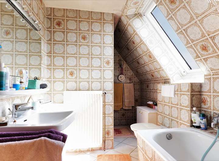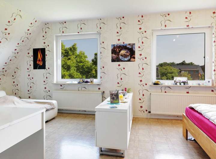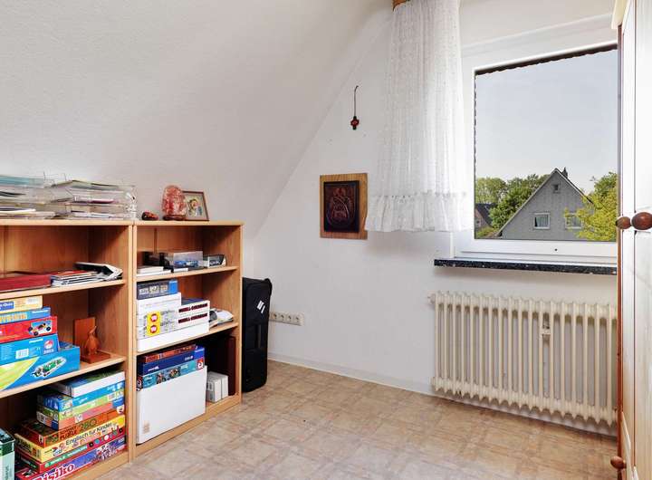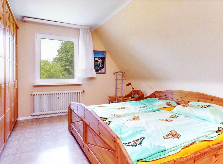 Eine massive Echtholztreppe führt ins Dachgeschoss mit drei Schlafzimmern und einem kleineren Zimmer, das sich gut als Büro oder Rückzugsort eignet. Auch das Badezimmer befindet sich hier.