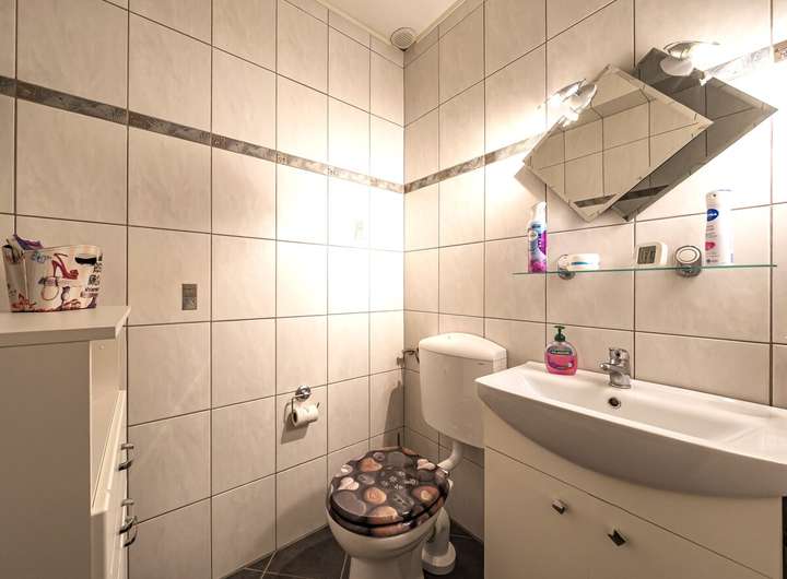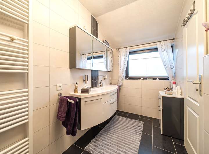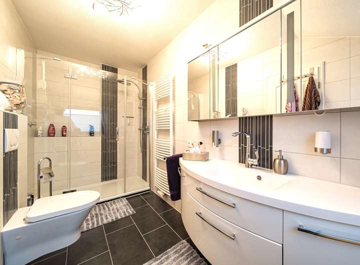 Sanitär: Modernisiertes Duschbad mit wandhängender WC-Anlage, Waschbecken und Handtuchheizkörper sowie ein innenliegendes Gäste-WC mit Waschbecken und Stand-WC