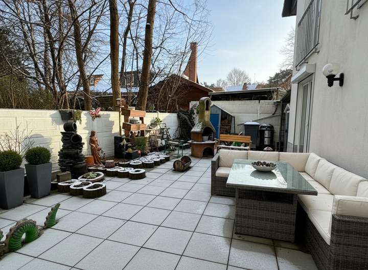 Der Außenbereich zeichnet sich pflegeleicht durch eine einladende Terrasse aus. Sie bietet ideale Voraussetzungen für entspannte Stunden an der frischen Luft und gemeinsames Essen im Freien. Für Grillfreunde steht ein Außenkamin zur Verfügung, der auch an kühleren Abenden wohlige Wärme spendet.
