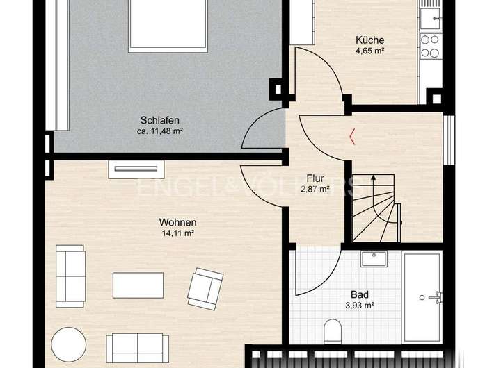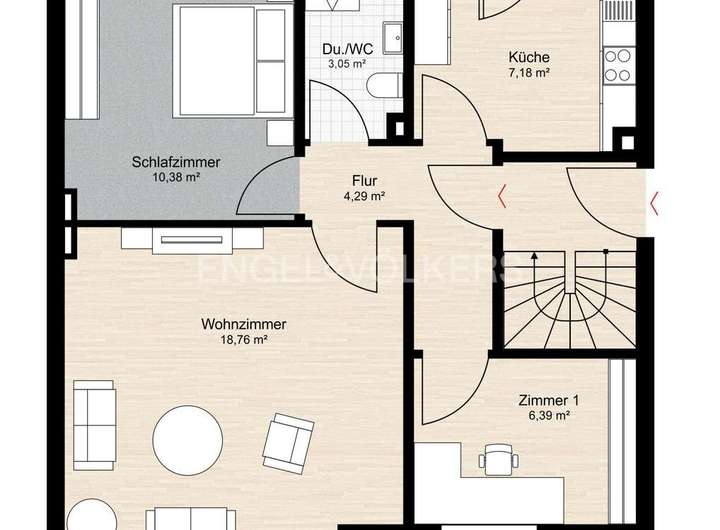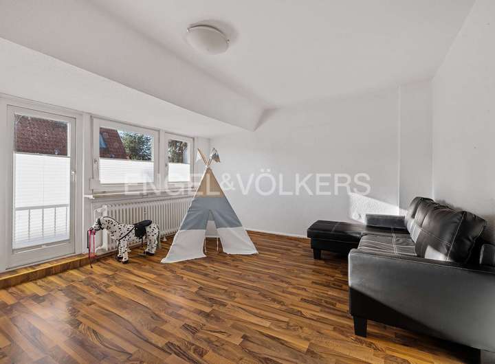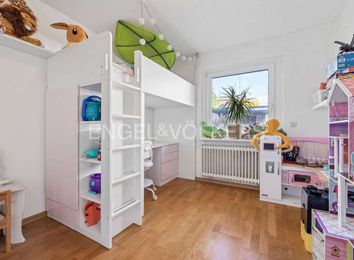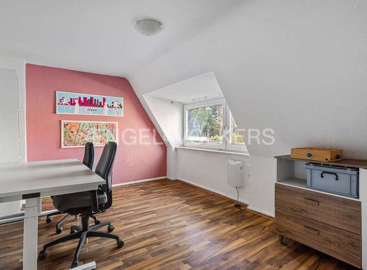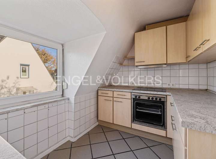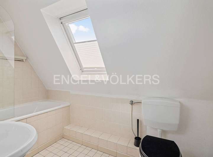 Das Obergeschoss erstreckt sich über ca. 38 m² und bietet neben der Küche und einem Wannenbad zwei gut geschnittene, helle Räume. Das Wohnzimmer verfügt über einen Zugang auf den nach Süden ausgerichteten Balkon. Die Böden der Wohnräume sind mit Laminat ausgestattet und die schallisolierten Fenster verfügen über manuelle Außenrollläden. Der Spitzboden bietet bei Bedarf eine Ausbaureserve.