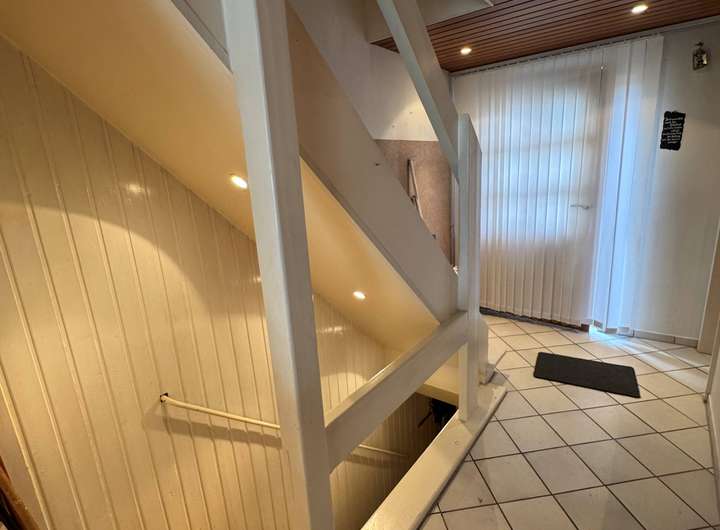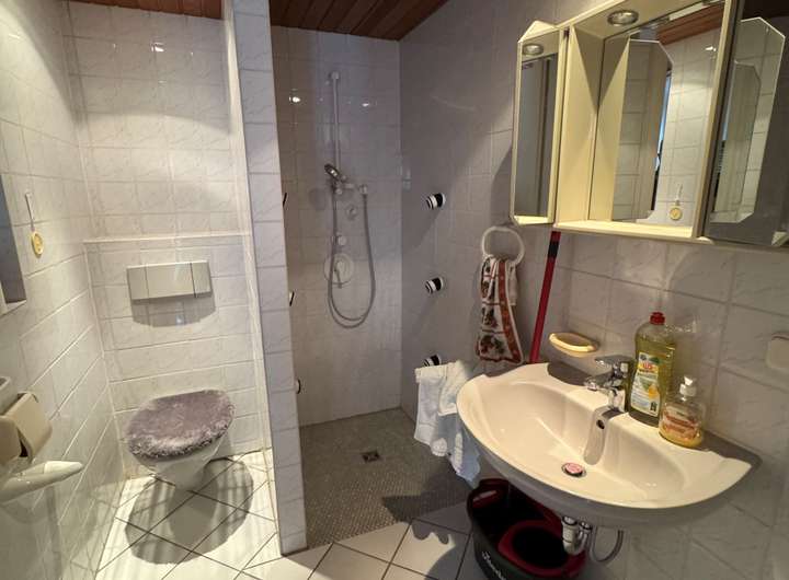 Im Erdgeschoss finden Sie den geräumigen Flur mit Zugang zum Tageslichtbad (mit bodengleicher Dusche), den Küchenbereich (zur Zeit durch eine nicht tragende Wand vom Wohnbereich getrennt - ideal
