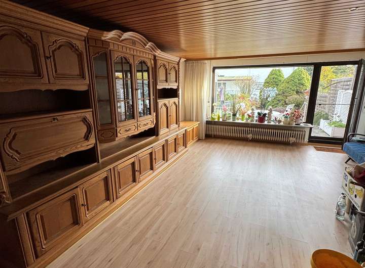 um hier später den Kochbereich problemlos in den Wohnraum als offene Küche zu integrieren), sowie den Wohn,- Essbereich, welcher durch einen Anbau auf über 28 m² vergrößert wurde. Von hier aus betreten Sie die nach Süd-Westen ausgerichtete Terrasse mit Zugang zum Gartenbereich. Seitlich an der Terrasse wurde ein separater Zugang zum Kellergeschoss errichtet.
