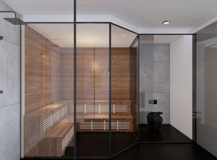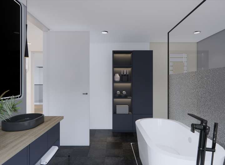 Luxuriöses Masterbad en Suite mit freistehender Badewanne, Walk-In-Dusche, Doppelwaschtisch und Dusch-WC. Optionaler Wellnessbereich mit Sauna, Duschbad und Fitnessraum. Vorbereitung für Jacuzzi am Master-Bedroom.