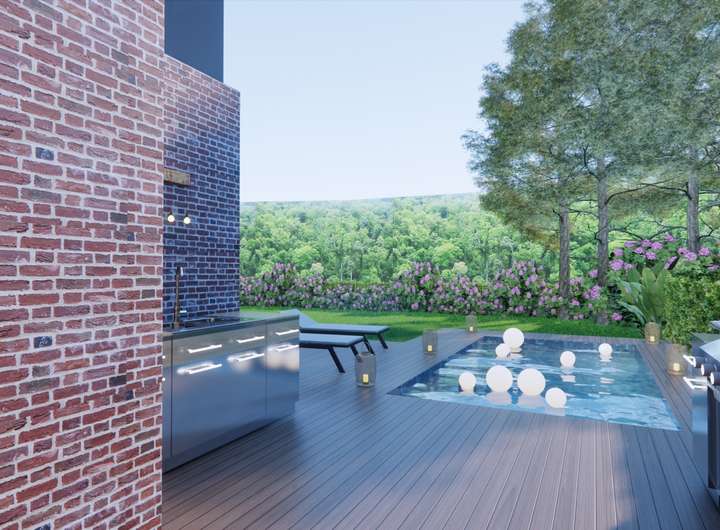 Garage mit beheiztem Boden, Carport optional. Ca. 750 m² Süd-West-Grundstück mit großzügiger Terrasse (ca. 60 m²), Pool mit Gegenstromanlage, Dachterrasse mit Lounge und Jacuzzi-Option sowie Outdoor-Küche mit Gasgrill und Kochinsel.