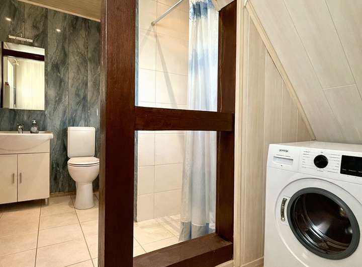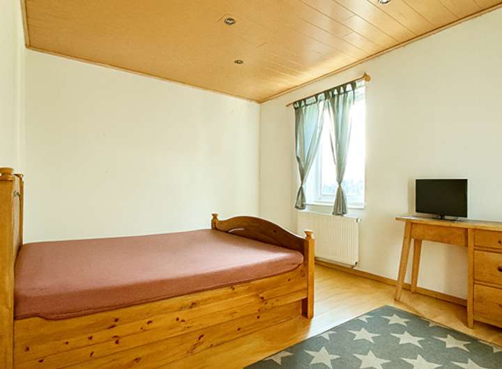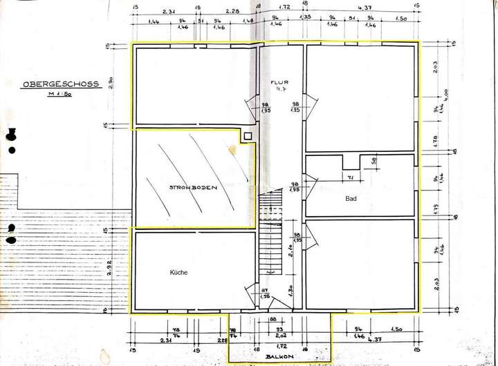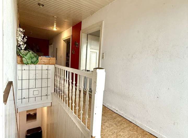 Die Wohnung im Obergeschoss wird vom PKW-Stellplatz erschlossen. Im Erdgeschoss befinden sich der Hauswirtschaftsraum mit angeschlossener Werkstatt. Eine Treppe führt in das Obergeschoss wo 3 Zimmer sowie Bad mit Dusche/ Wanne und Küche arrangiert wurden. Die Wohnfläche umfasst ca. 80 m². Diese Wohnung verfügt zusätzlich über einen Balkon und die Option auf ein 4. Zimmer (nach Umbau). Das Dachgeschoss bietet eine zusätzliche Ausbaureserve. Das Haus ist nicht unterkellert. Das Gebäude wird über Heizkörper in den Räumen sowie eine Gas-Zentralheizung mit Wärmemengenzählern.