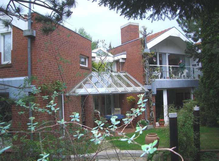 Dieses besondere Terrassen-Chalet-Haus aus dem Baujahr 1984 ist als zweiteiliges Giebelreihenmittelhaus mit großem, verglasten Mitteltrakt auf einem 420,25 m² großen Grundstück auf insgesamt ca. 246,8 m² Wohnfläche in massiver Bauweise errichtet.