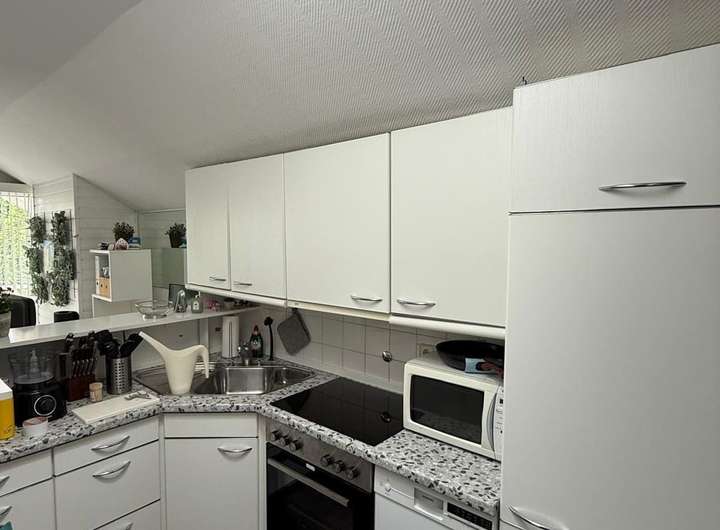 Eine moderne Einbauküche mit angrenzendem Abstellraum, sowie einem neuen Dachflächenfenster (motorisch) zur zusätzlichen Belüftung wurden verbaut. Von hier fällt der Blick in die Grünzone.