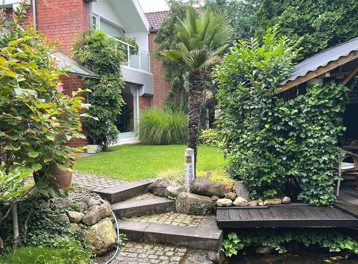 Der sich an die Terrasse anschließende Garten, von der Straße aus nicht einsehbar, wurde nach der aufwendigen Neugestaltung (2023) im Mittelteil auch mit einem Teich mit Steg und einer Natursteinmauer versehen - eine Oase der Ruhe.