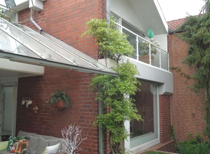 Eine Loggia schließt sich an das Wohnzimmer (ca. 18,37 m²) in südlicher Ausrichtung mit Blick in den Garten an. Der gesamte Wohnbereich ist zur Loggia hin verglast.
