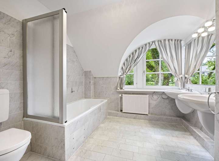 Beide Bäder sind mit hellem Marmor, Fußbodenheizung und einem Fenster ausgestattet. Das Hauptbadezimmer verfügt zudem über eine Badewanne und zwei Waschbecken – ideal für den Familienalltag. In 2025 wurde im Duschbad eine tieferliegende Duschwanne mit Glastrennwand neu eingebaut. 2024 wurden die Toiletten im Gäste-WC und im Wannenbad ausgetauscht, um höhere Sitzfläche zu erhalten.