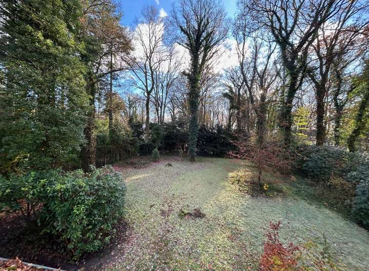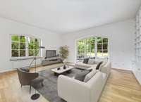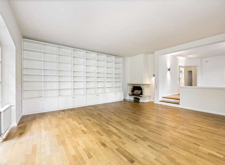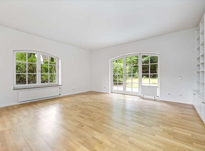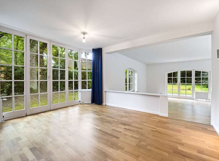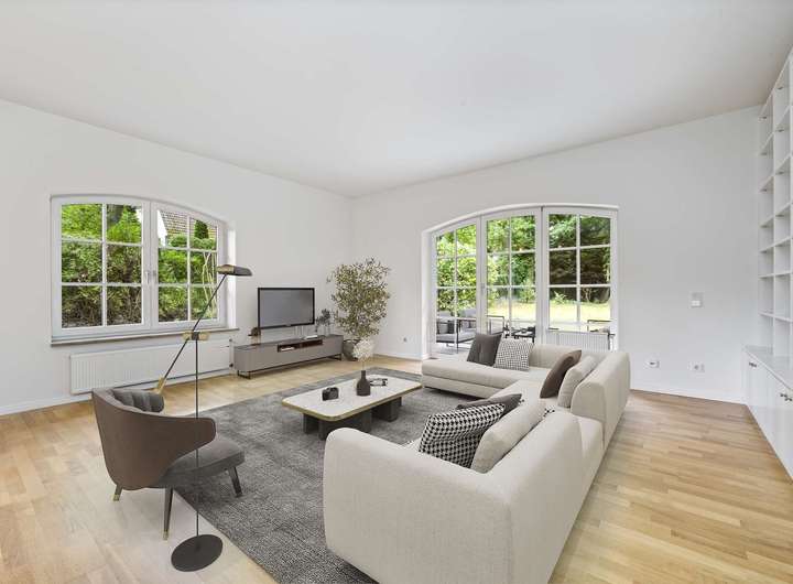 Eine Tür mit Glaseinsätzen führt Sie in den lichtdurchfluteten Essbereich mit bodentiefem Erkerfenster und direktem Zugang zur Ost-Terrasse. Nur zwei Stufen tiefer öffnet sich der angrenzende Wohnbereich mit einem gemütlichen Kamin. Der offen gestaltete Wohn-/Essbereich bietet viel Platz zur individuellen Möblierung und einen traumhaften Blick in den parkähnlich angelegten Garten. Zwei große Tür-Fenster-Elemente verbinden harmonisch Innen- und Außenraum.