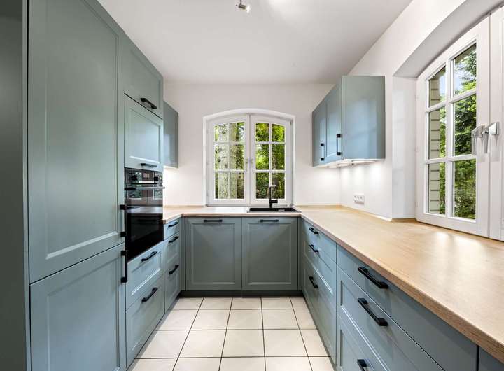 Die moderne Einbauküche inklusive gängiger Elektrogeräte wurde erst 2022 neu eingebaut und profitiert von natürlichem Tageslicht durch zwei Fenster.