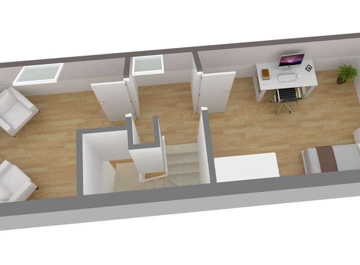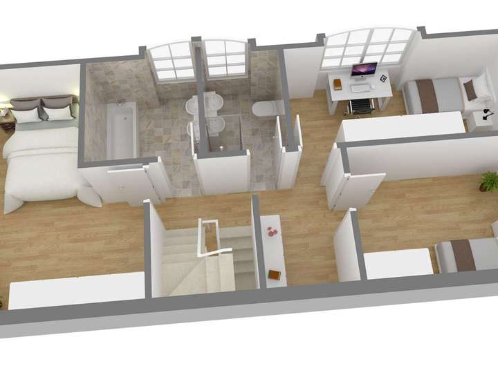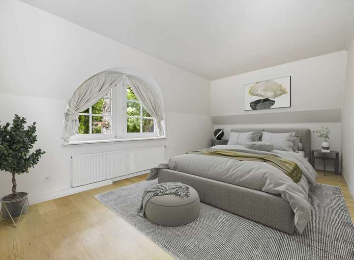 Über eine Treppe gelangen Sie in das Obergeschoss, wo sich drei individuell geschnittene Schlaf- bzw. Kinderzimmer sowie zwei Tageslichtbäder befinden.